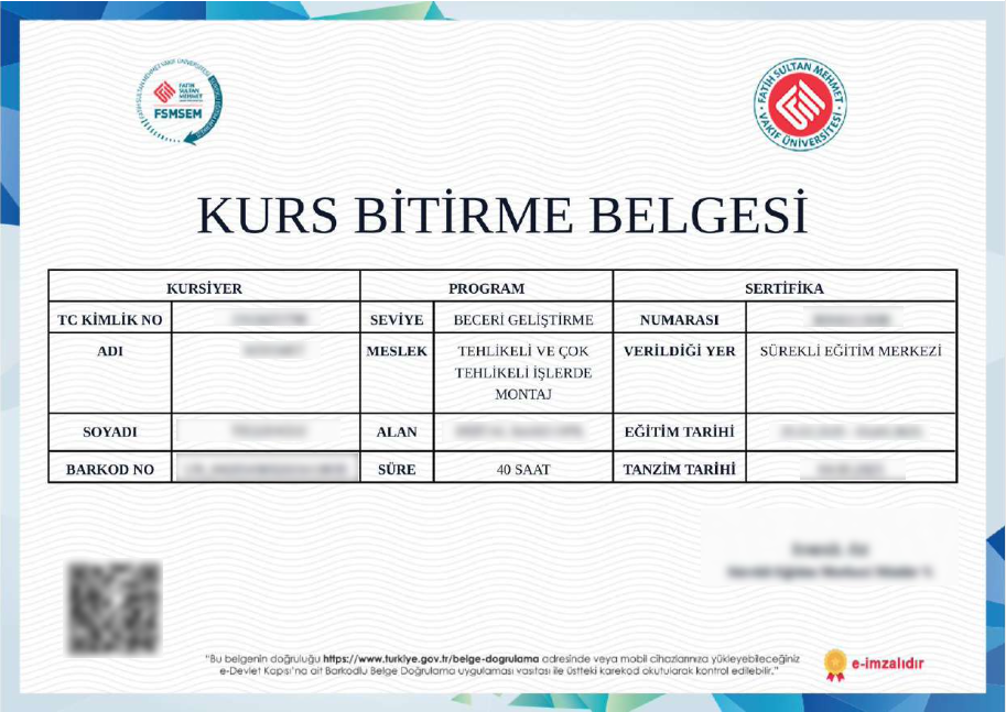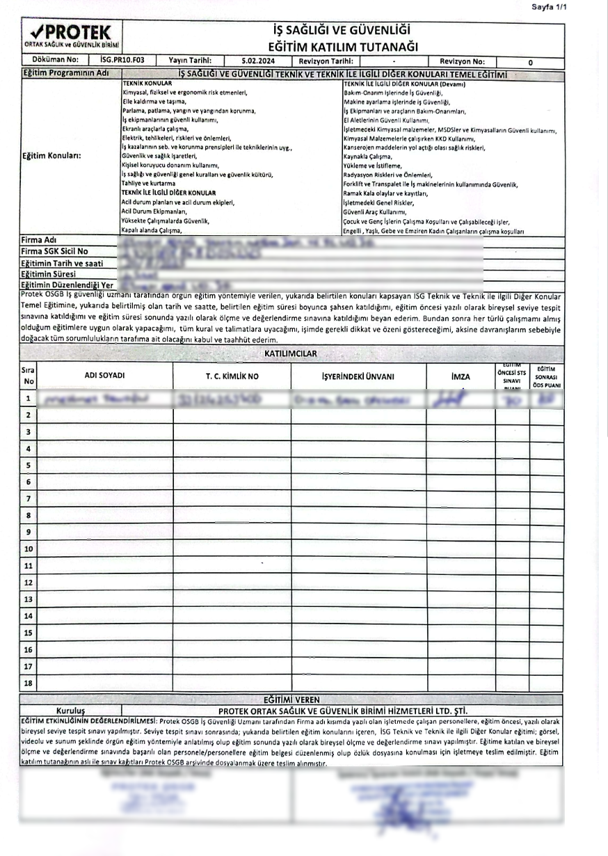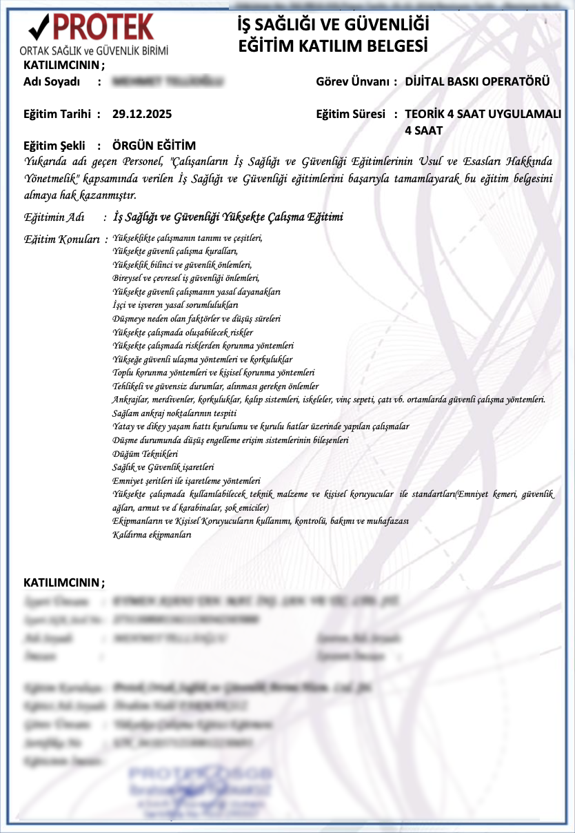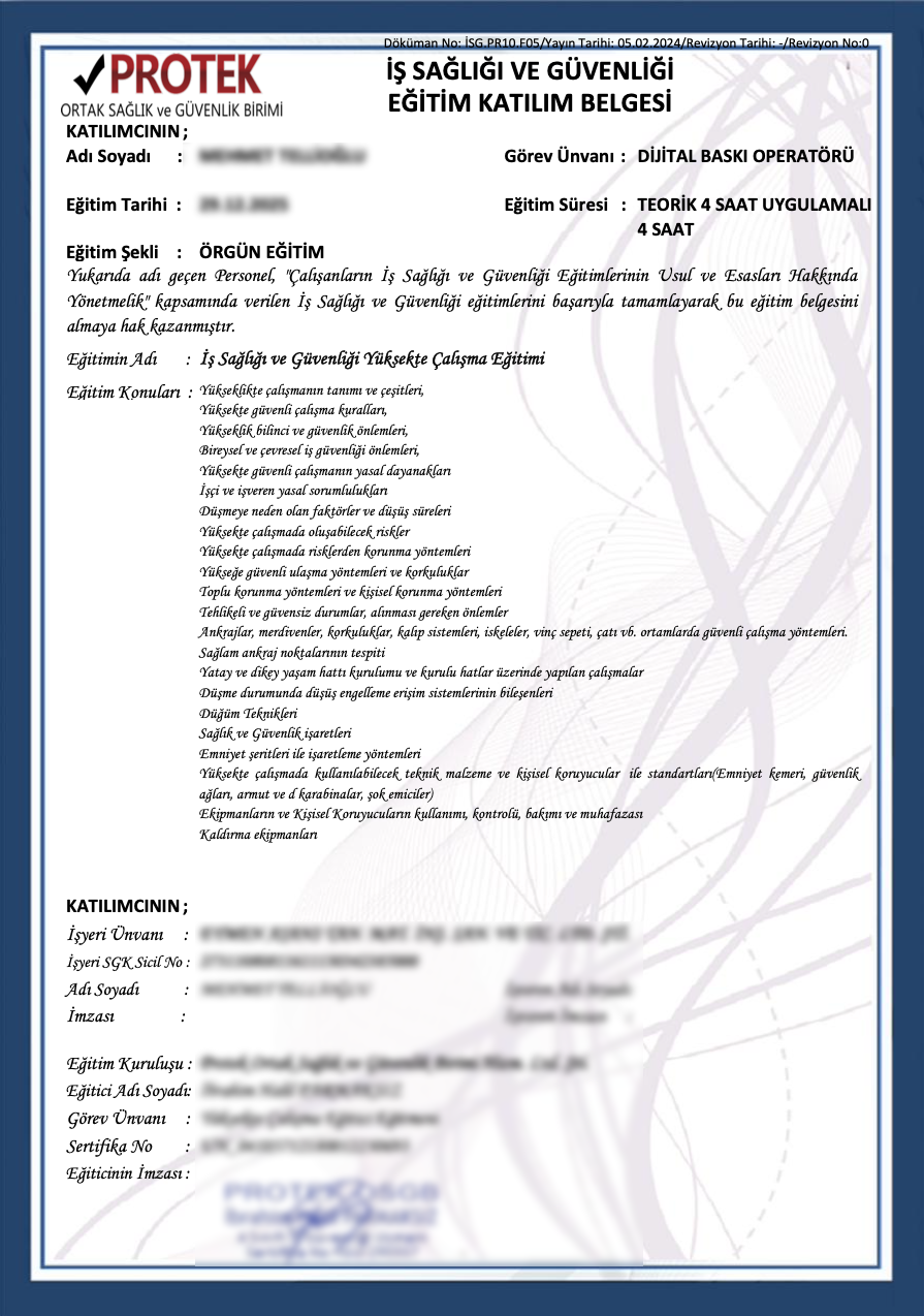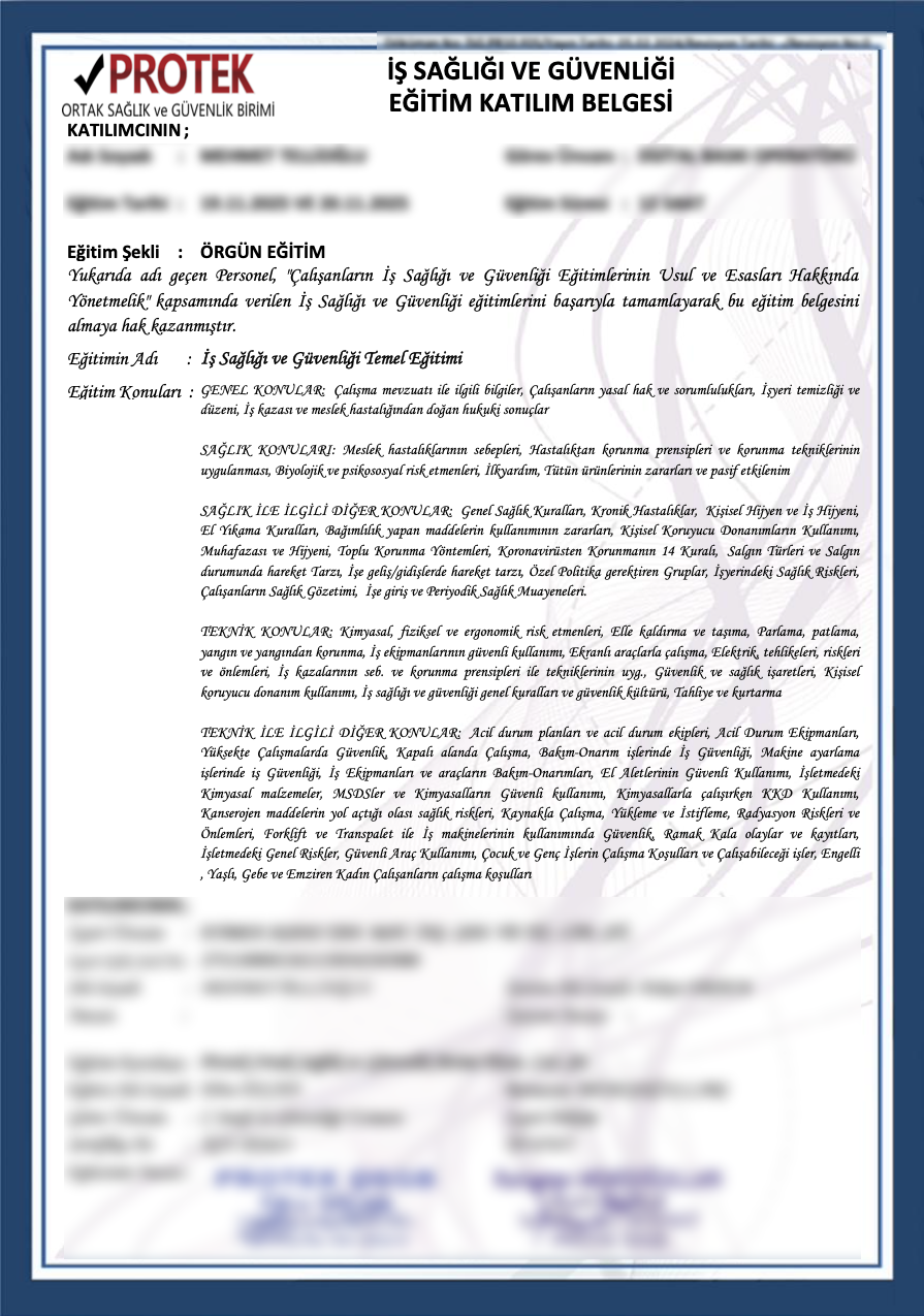 Firmamızın iş sağlığı ve güvenliği başta olmak üzere tüm yasal belge ve sertifikaları mevcuttur.